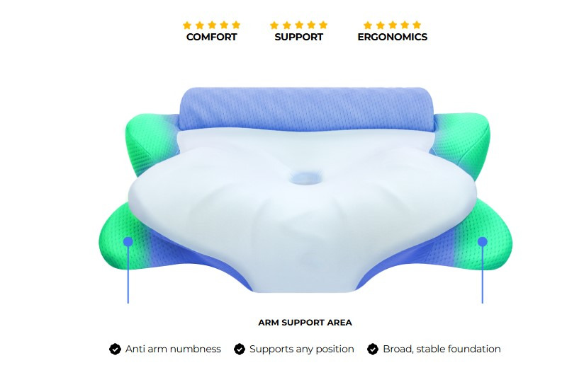 One of the biggest selling points is its contoured shape. Instead of a flat surface, the pillow features raised edges and a central dip. This design helps: